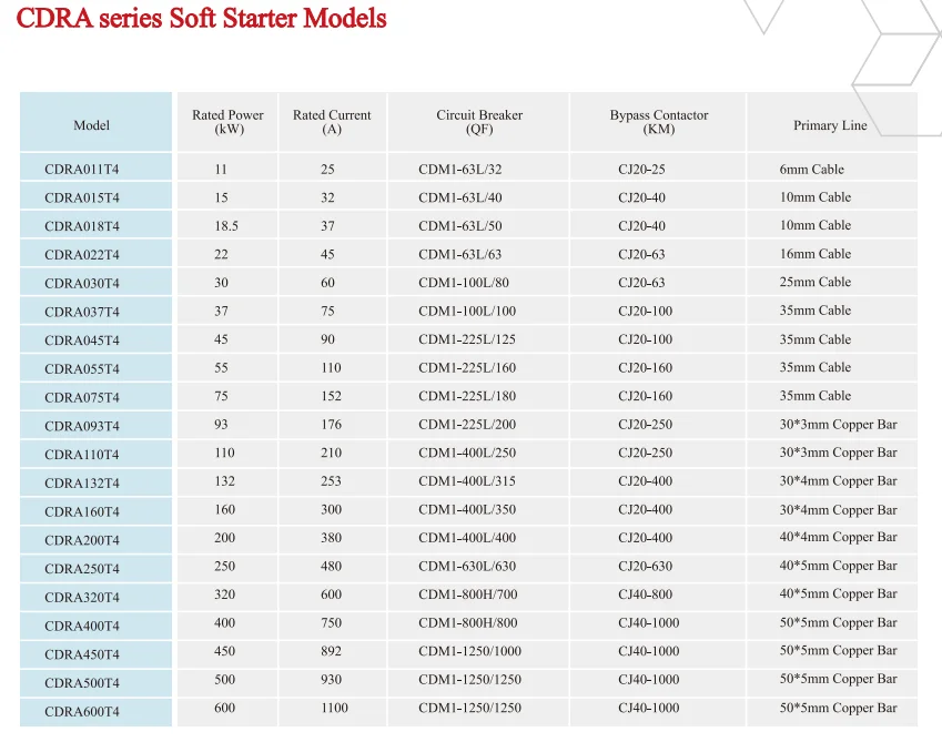 Delixi built-in bypass soft starter CDRA-K3 series is a motor control equipment that integrates soft start, soft stop and multi-function protection. Achieve smooth starting motor without shock during the whole starting process. The CDRA-K3 series has a built-in bypass contactor and control power supply. Simply connect the input end of the soft starter to the circuit breaker, and the motor is directly connected to the output terminal of the soft starter and powered on to use.